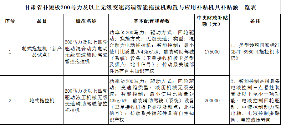 按我省公告《甘肃省补短板200马力及以上无级变速高端智能拖拉机购置与应用补贴机具补贴额一览表》执行,详见下表。根据列补产品市场价格变化情况,适时调整补贴额。