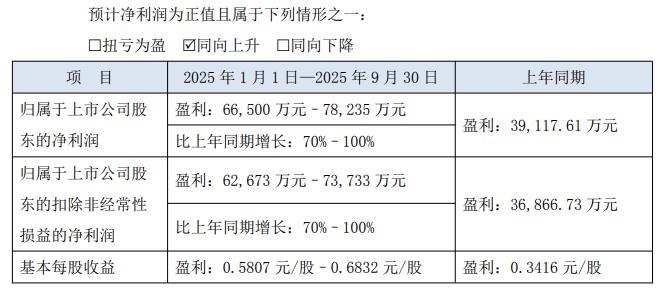 10月15日,宗申动力发布2025年前三季度业绩预告,预计2025年前三季度归属于上市公司股东的净利润为6.65亿元–7.82亿元,比上年同期增长70%–100%。基本每股收益为0.5807元/股–0.6832元/股。
