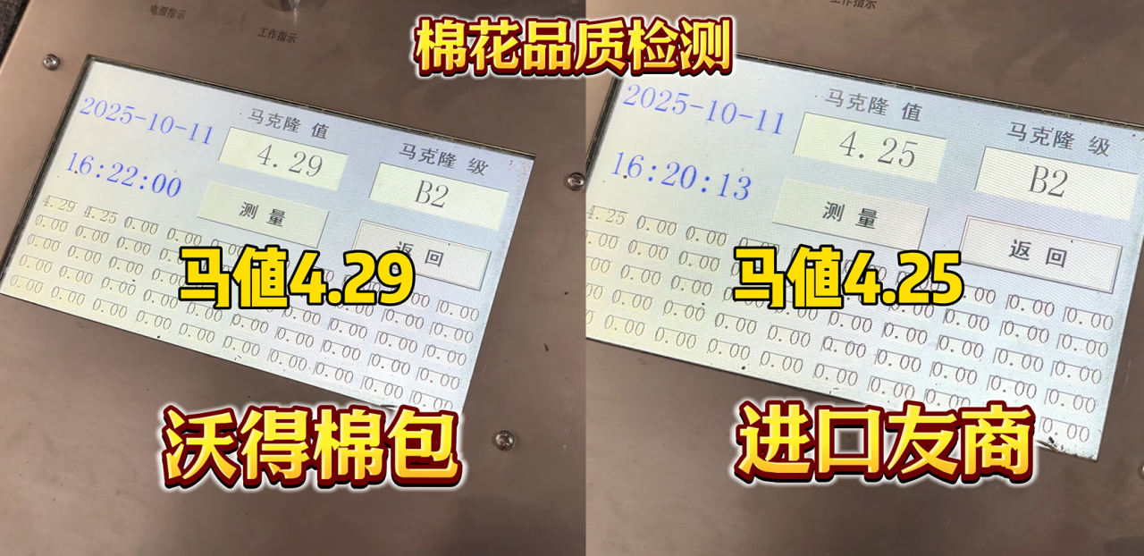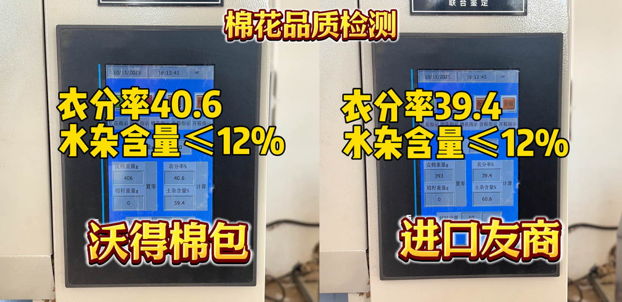 检测结果令人惊喜:沃得采棉机的棉包衣分率达40.6,高于进口友商棉包的39.4;马值为4.29,比友商的4.25还高出0.04,两项关键指标均更优异。