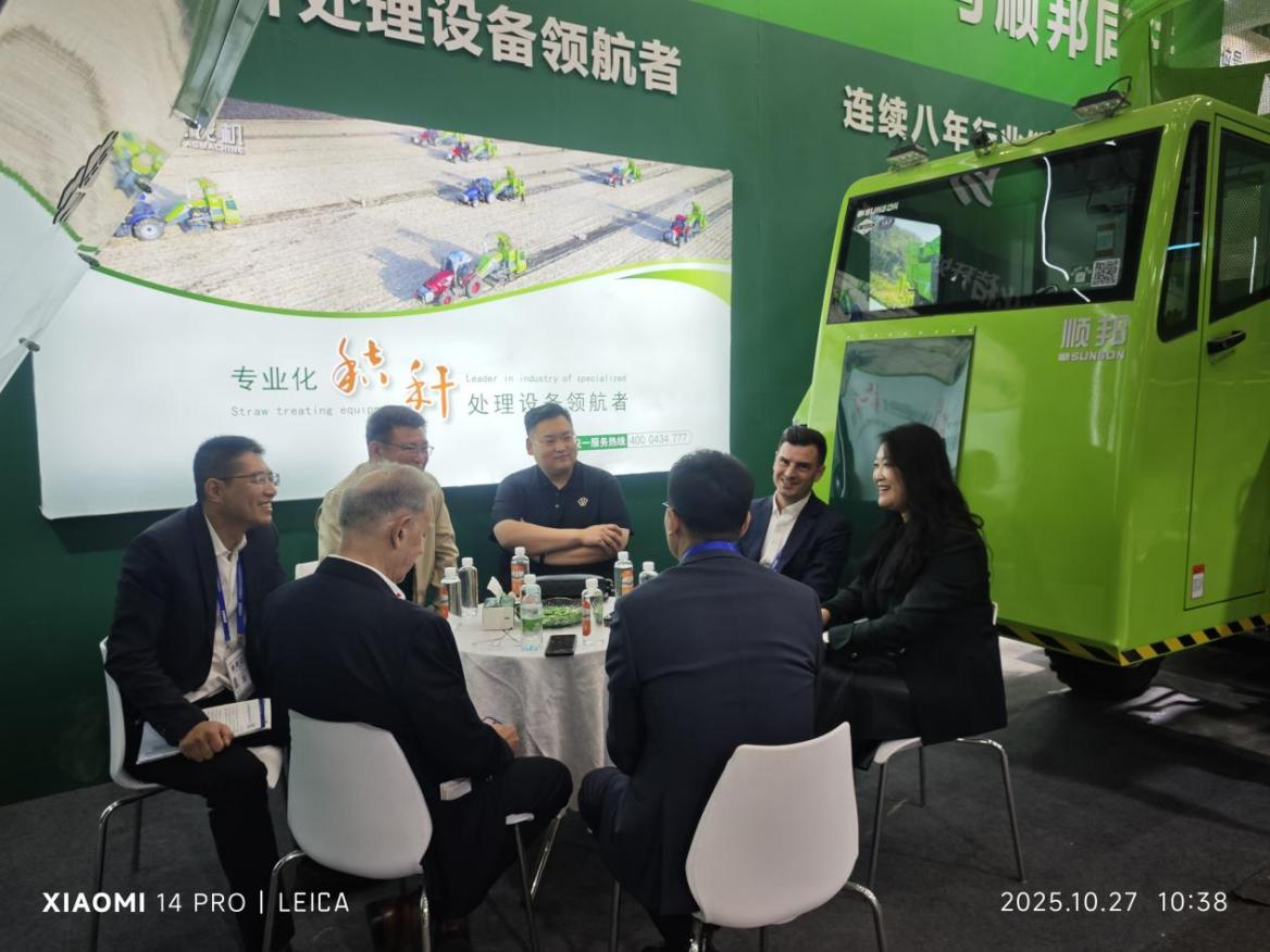秸秆专业化收储设备领航企业——四平市顺邦农机制造有限公司(简称“顺邦农机”)携多款明星产品重磅亮相展会。作为国际农机展连续多年来从未缺席的重要级展商,顺邦展台人气爆棚,凭借专业、高效、耐用、高性价比等特点积累的广泛用户基础,以及代表着鲜活生命力“绿意盎然”的主题色彩,一经开展变成为了全场焦点,新老用户齐聚展台前,参观、咨询、洽谈的人流络绎不绝。