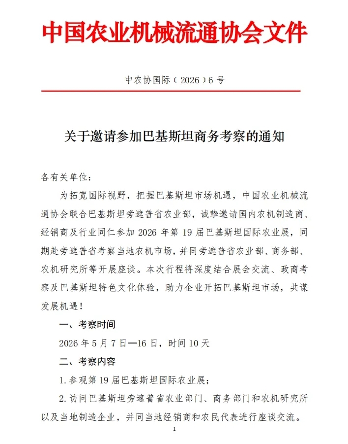 为拓宽国际视野,把握巴基斯坦市场机遇,中国农业机械流通协会联合巴基斯坦旁遮普省农业部,诚挚邀请国内农机制造商、经销商及行业同仁参加 2026年第19届巴基斯坦国际农业展,同期赴旁遮普省考察当地农机市场,并同旁遮普省农业部、商务部、农机研究所等开展座谈。本次行程将深度结合展会交流、政商考察及巴基斯坦特色文化体验,助力企业开拓巴基斯坦市场,共谋发展机遇!